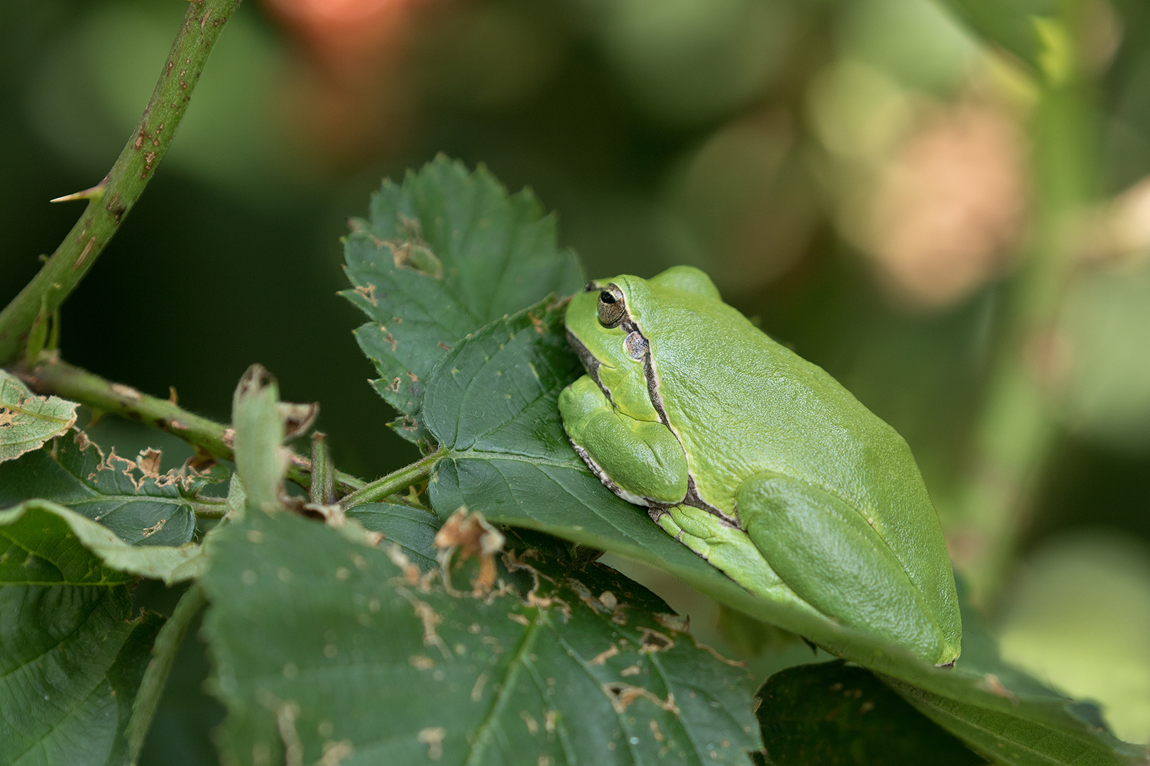 Boomkikker op bramenblad – Hyla arborea – European tree frog (a)