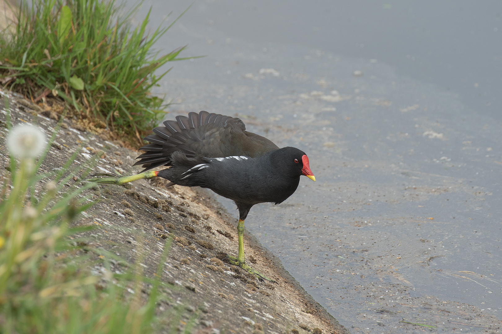 Waterhoen strekt vleugel – Gallinula chloropus (a)